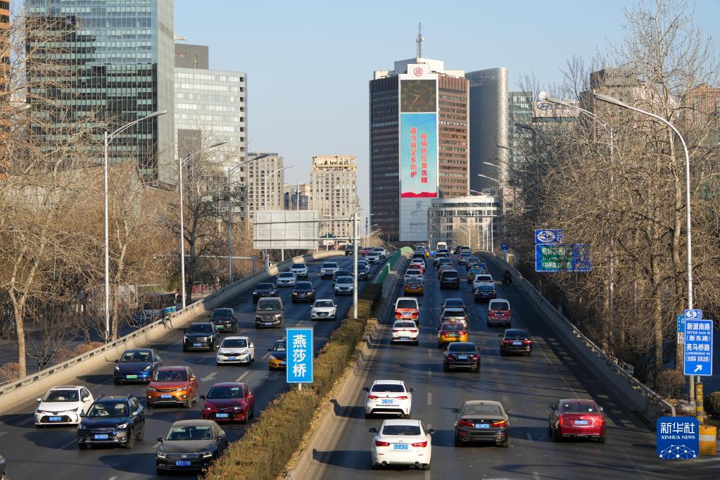 1月3日上午在北京市朝陽區東三環路上拍攝的車流。