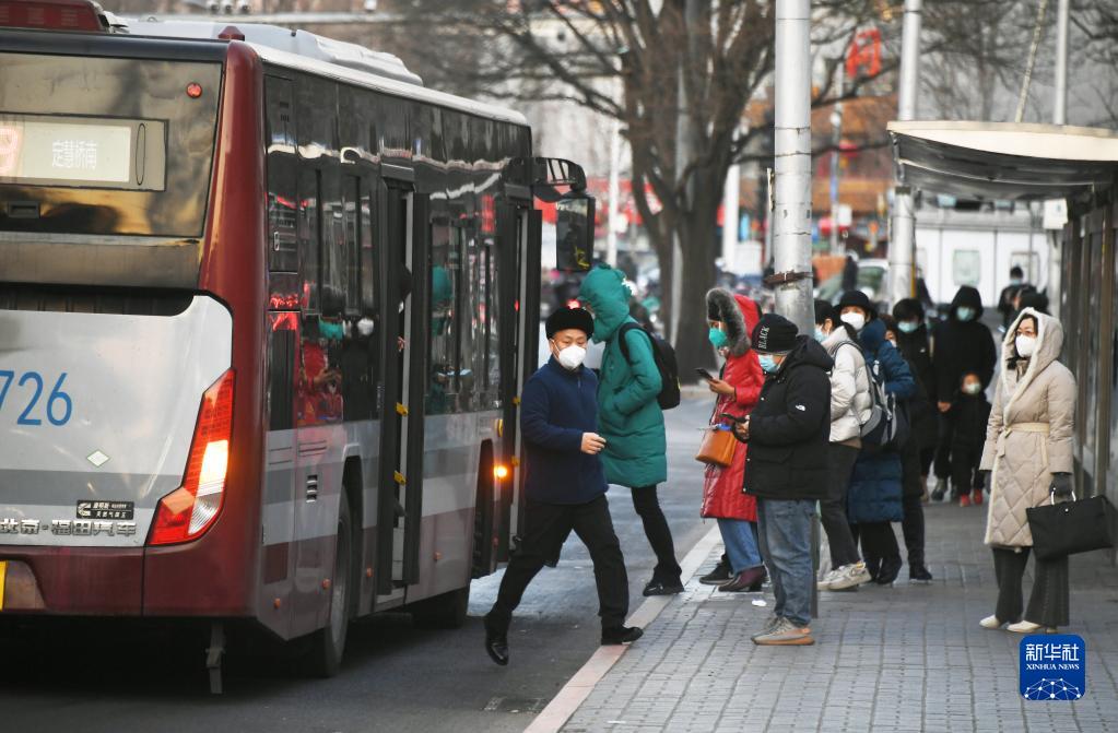 1月3日早高峰時段,市民在位于北京市海淀區的四通橋東公交站乘車。