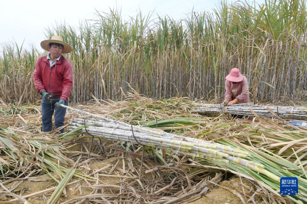 1月2日,在廣西河池市羅城仫佬族自治縣小長安鎮守善村,農民在甘蔗地里砍收甘蔗。