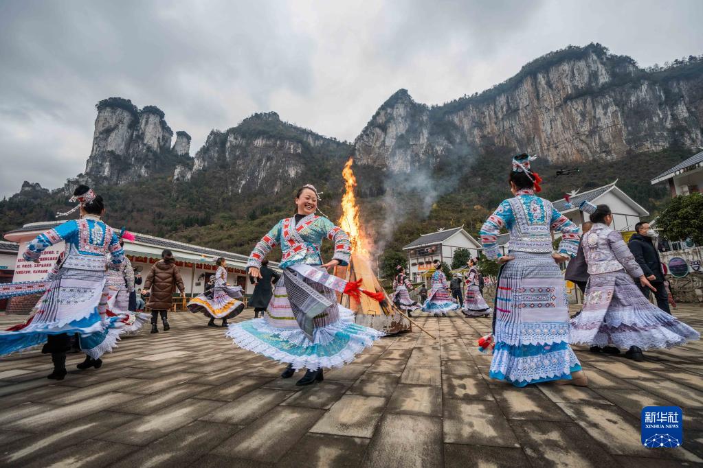 1月2日,游客在貴州省黔西市新仁苗族鄉化屋村和苗族同胞一起圍著篝火跳舞。