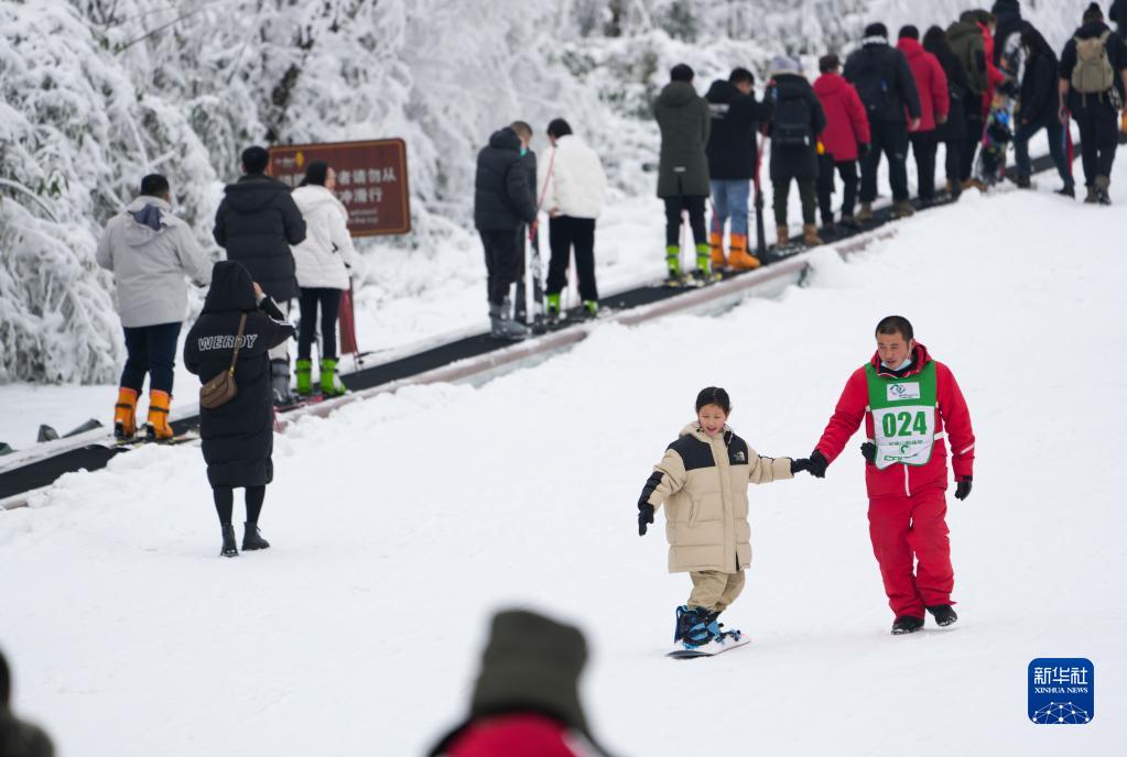 1月1日,在重慶市南川區金佛山景區滑雪場,一名小游客在雪場教練的指導下練習滑雪。