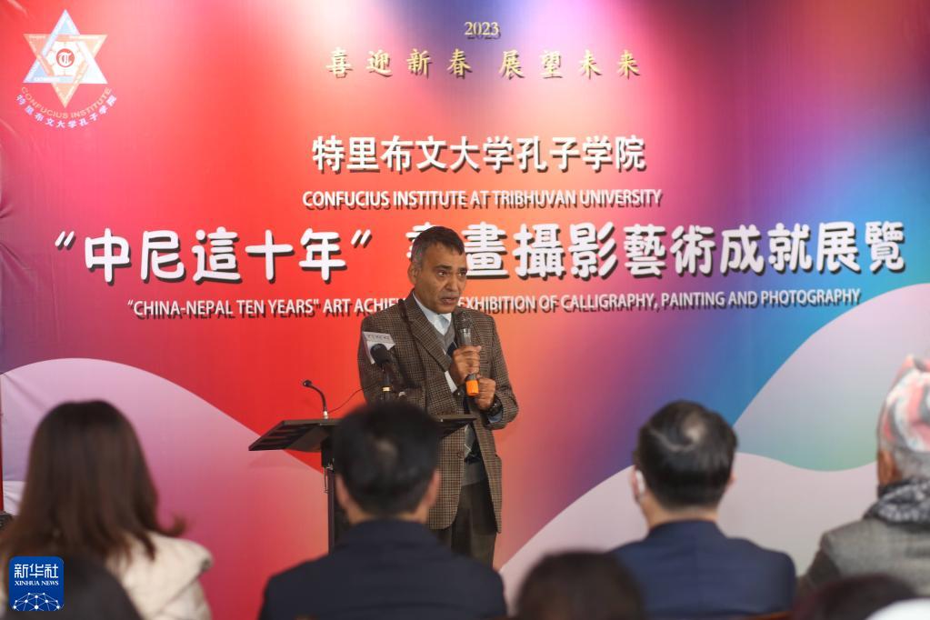 1月3日,在尼泊爾首都加德滿都,特里布文大學(xué)孔子學(xué)院尼方院長巴爾穆昆達(dá)·雷格米在“中尼這十年”書畫攝影藝術(shù)成就展開幕式上講話。
