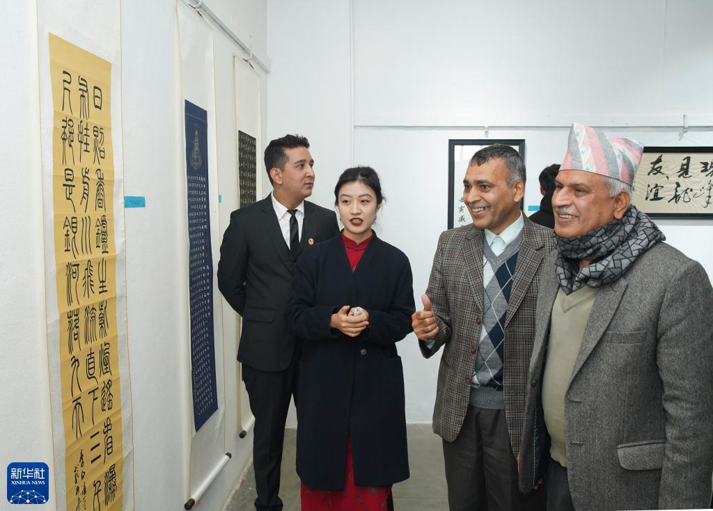1月3日,在尼泊爾首都加德滿都,特里布文大學孔子學院尼方院長巴爾穆昆達·雷格米(右二)在“中尼這十年”書畫攝影藝術成就展上欣賞書法作品。