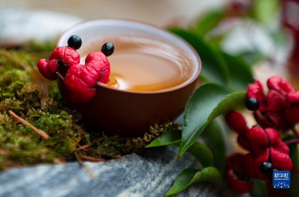 1月1日在福建省武夷山國(guó)家公園拍攝的野鴨椿果實(shí)。這是當(dāng)?shù)匦『畷r(shí)節(jié)的特色野果,因其果實(shí)形似孩童,當(dāng)?shù)厝朔Q其為“紅袍娃”。
