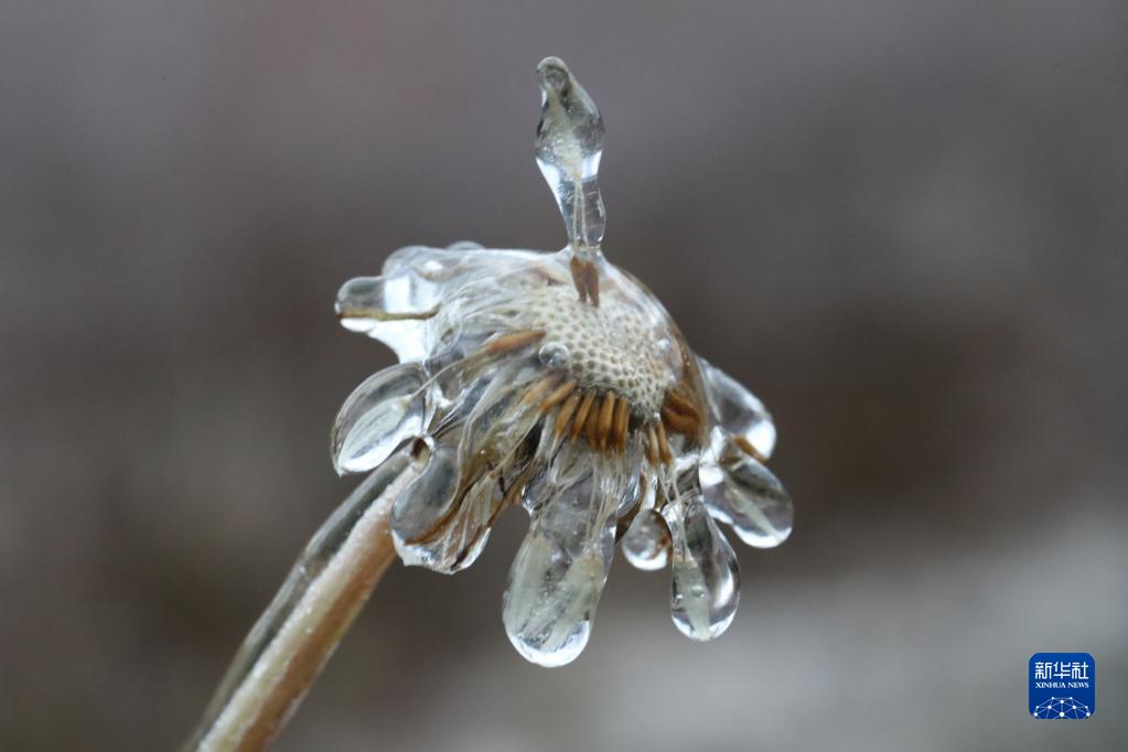 1月2日,在云南省騰沖市打鷹山中,一株枯萎的蒲公英上結(jié)了冰。
