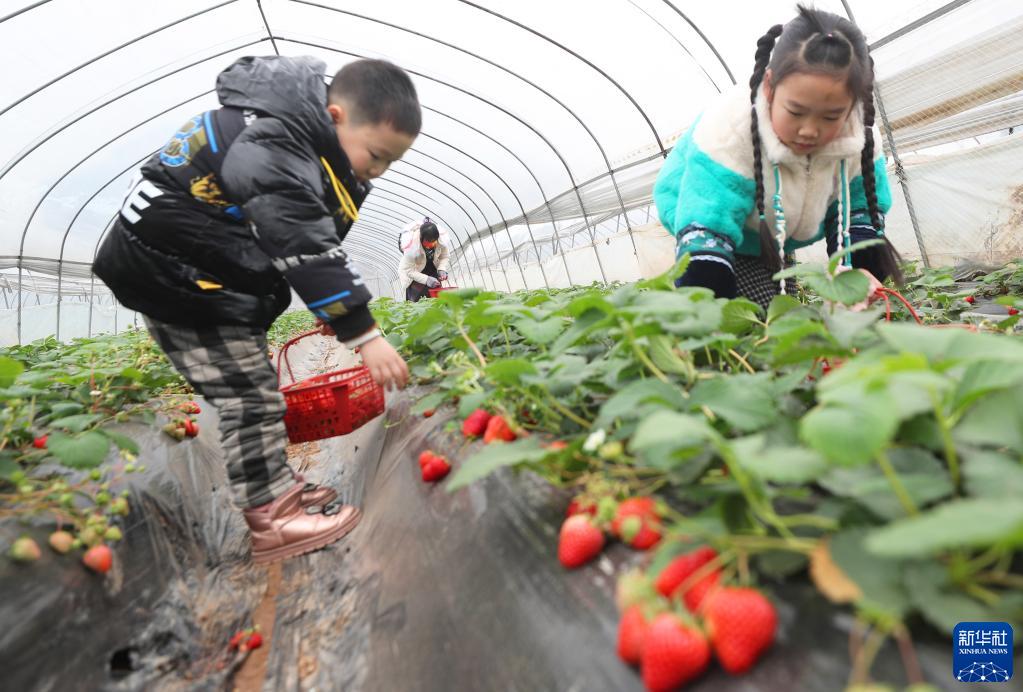 1月3日,人們在衡陽市衡東縣吳集鎮秋波村草莓種植基地采摘草莓。