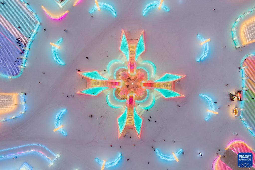 冬日夕陽下,第24屆哈爾濱冰雪大世界園區(qū)流光溢彩,夢幻壯觀,來自天南海北的游客在園區(qū)內(nèi)暢享冰情雪趣。