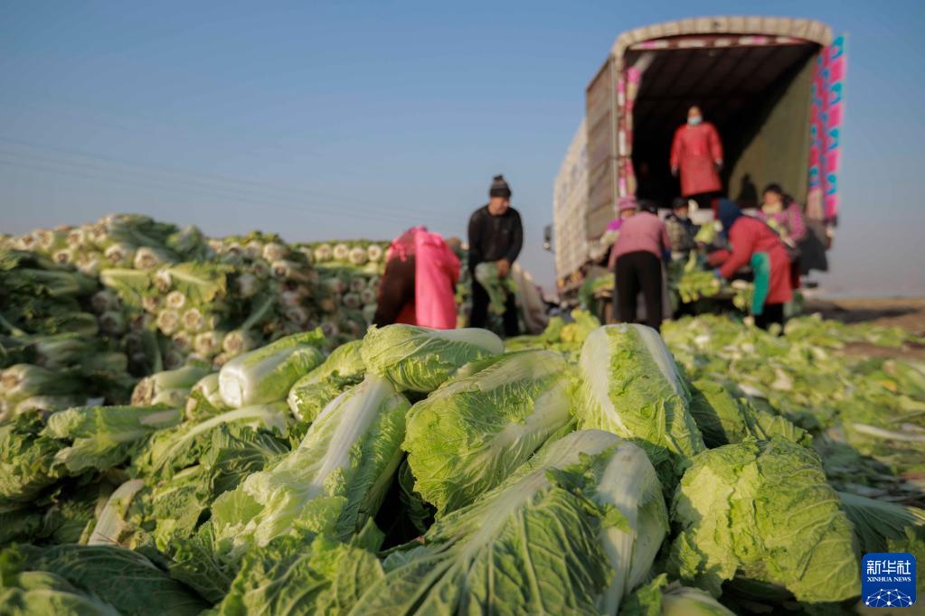 1月4日,河北省玉田縣虹橋鎮農民將大白菜裝車外運。