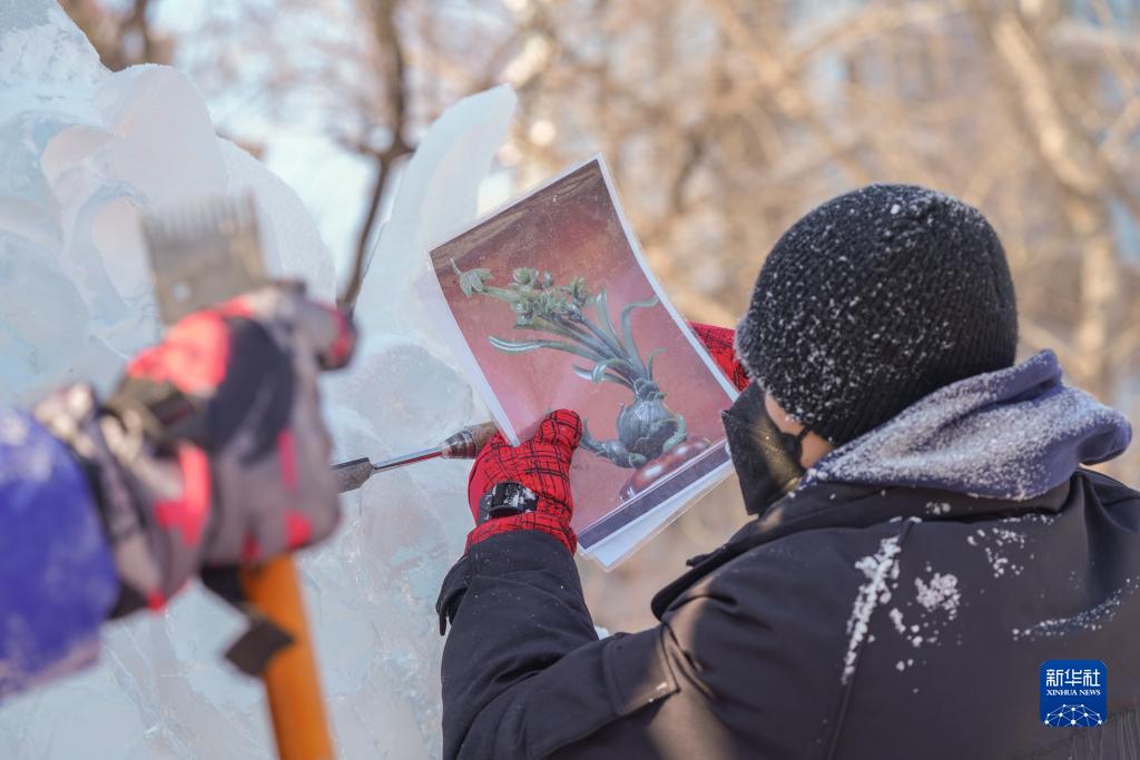 1月4日,在哈爾濱冰燈藝術游園會園區,冰雕師在進行冰雕藝術作品創作。