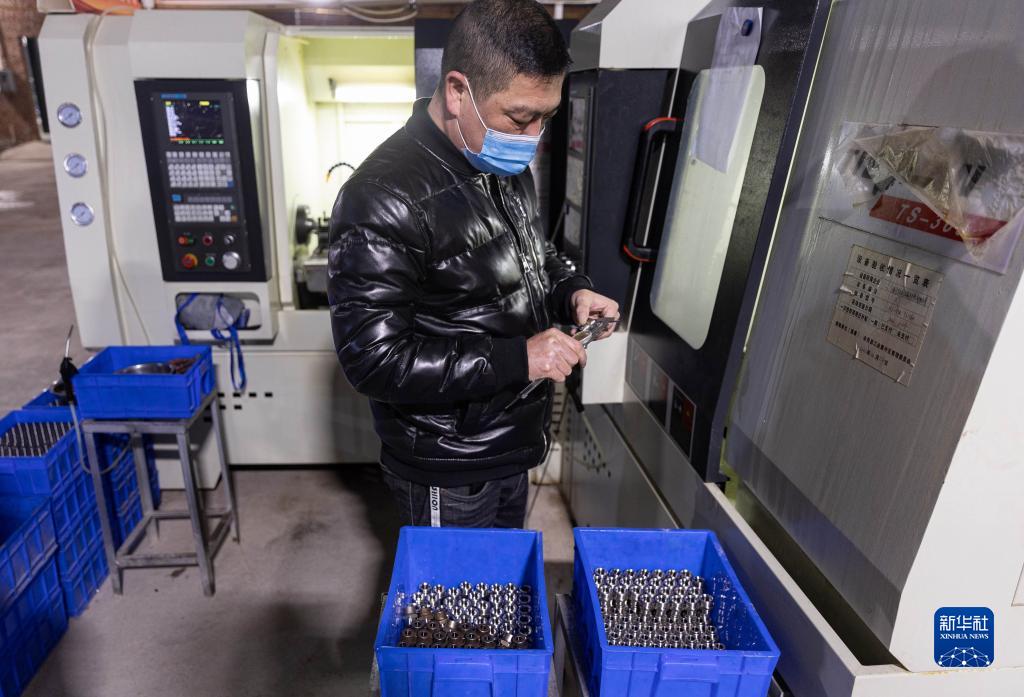 1月4日,在四川省會東縣小岔河特色產業園區一家汽車零部件企業的生產車間,一名在此就業的移民群眾在檢測液壓不銹鋼螺帽規格。