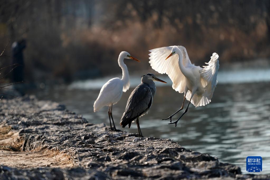1月4日,白鷺降落到太原市汾河岸邊。
