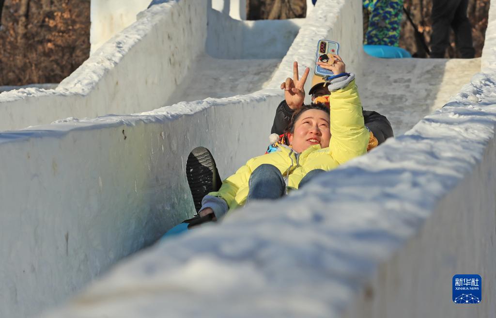 1月3日,游客在沈陽世博園體驗雪圈項目。