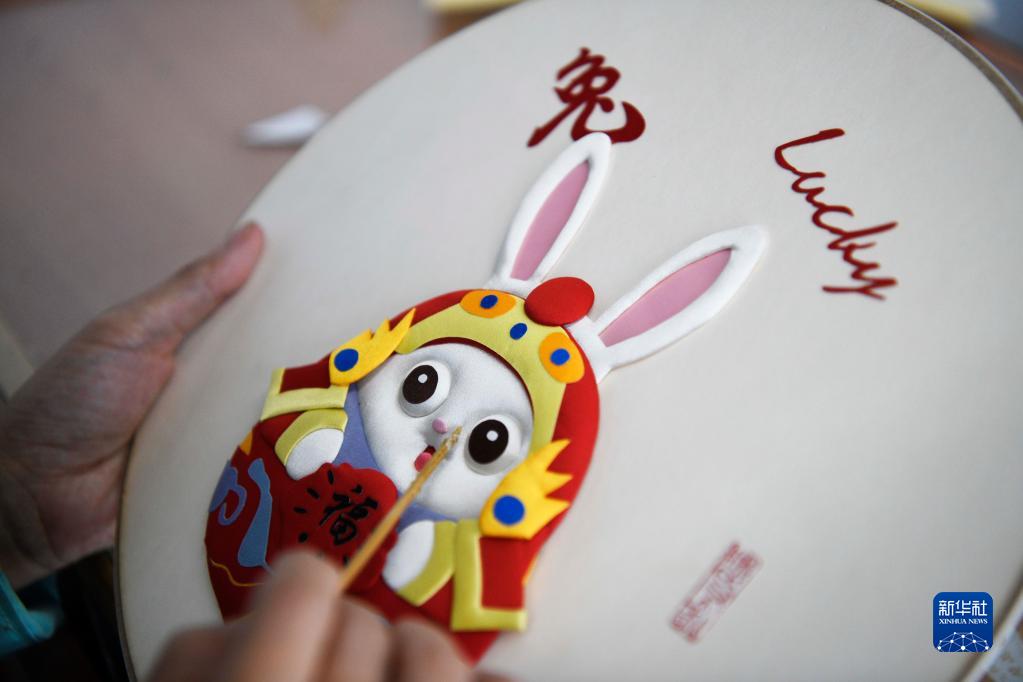 臘月里,河北省豐寧滿族自治縣布糊畫手工藝人以兔為主題,制作憨態可掬、萌味十足的兔年主題布糊畫,喜迎新春佳節。布糊畫是國家級非物質文化遺產,以綾羅綢緞等面料為主,在滿族傳統工藝“補花”的基礎上,取繪畫、浮雕、堆繡、剪紙、裱糊、布貼畫等傳統工藝精華結為一體,呈現出浮雕立體的效果。
