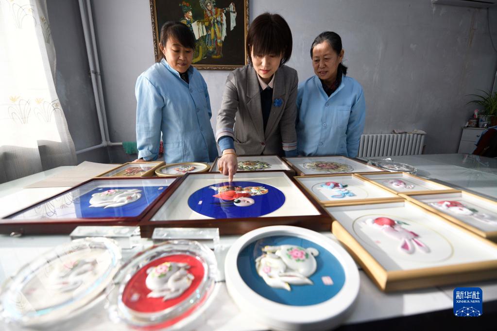 1月4日,在豐寧縣非遺布糊畫就業工坊,布糊畫傳承人郝如香(中)與手工藝人交流布糊畫制作經驗。