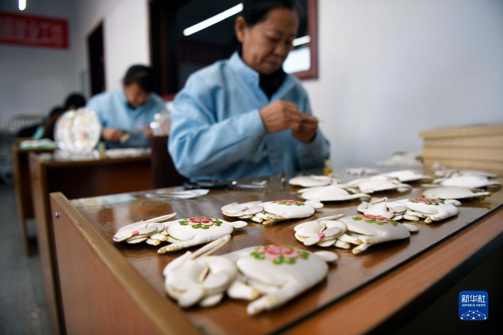 1月4日,在豐寧縣非遺布糊畫就業工坊,手工藝人在制作兔年主題布糊畫。