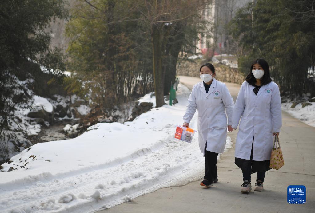 1月3日,西安市長安區灤鎮街道社區衛生服務中心醫生崔思語(右)和高丹陽在灃峪村內走訪住戶。