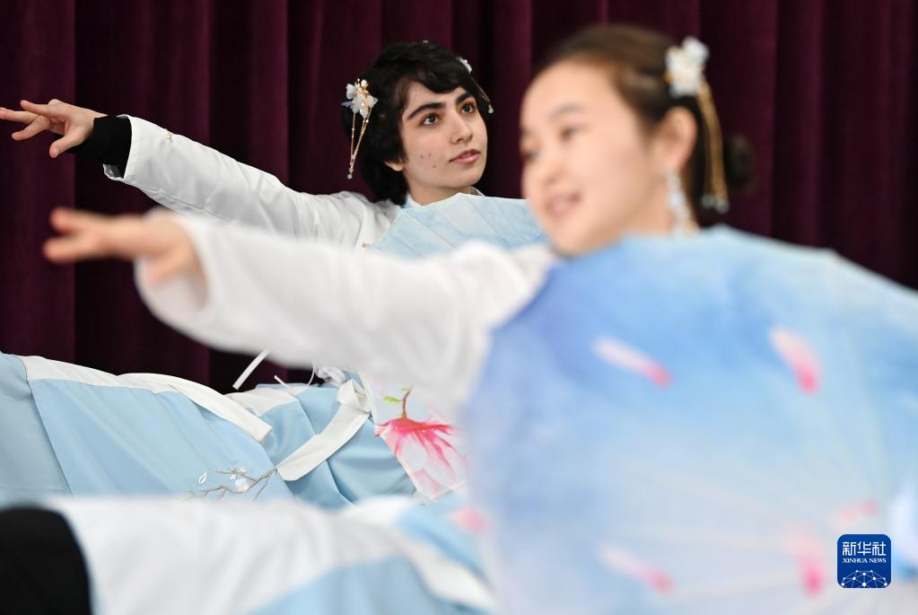 當(dāng)日,天津大學(xué)國(guó)際教育學(xué)院的留學(xué)生為參加“校園春晚”加緊排練文藝節(jié)目。他們身穿漢服演唱中文歌曲,排練傳統(tǒng)古典舞蹈等節(jié)目,感受中國(guó)傳統(tǒng)文化的魅力。