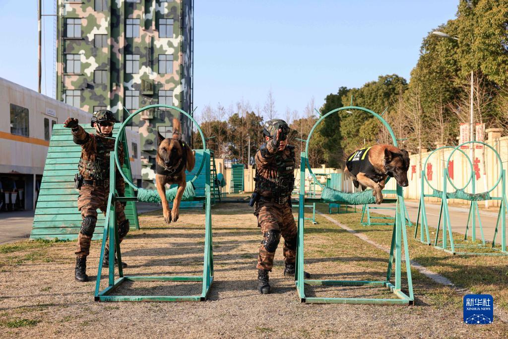 1月3日,武警上海總隊機動第一支隊警犬班官兵指揮警犬進行通過障礙物訓練。