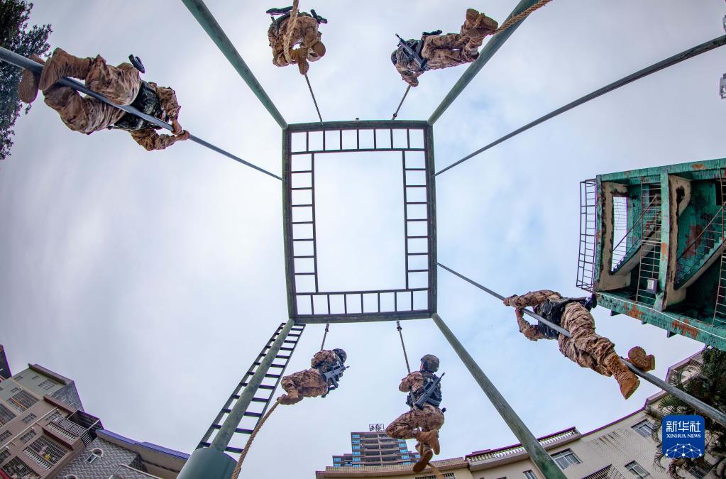 1月4日,武警廣西總隊北海支隊特戰隊員進行爬繩(桿)訓練。