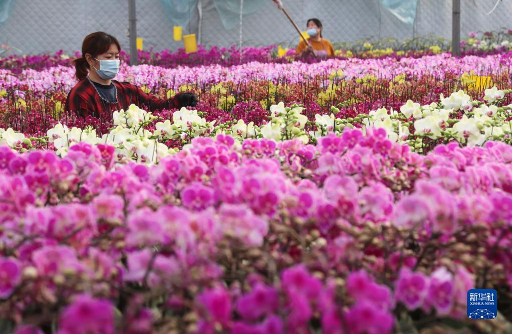 1月4日,工人在河北省張家口經(jīng)濟開發(fā)區(qū)流平寺村蝴蝶蘭基地管護蝴蝶蘭花。
