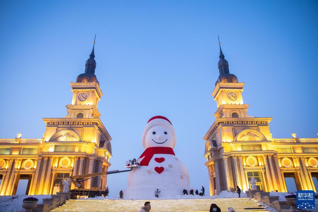 1月4日,在哈爾濱松花江畔,工人進(jìn)行大雪人收尾工作。