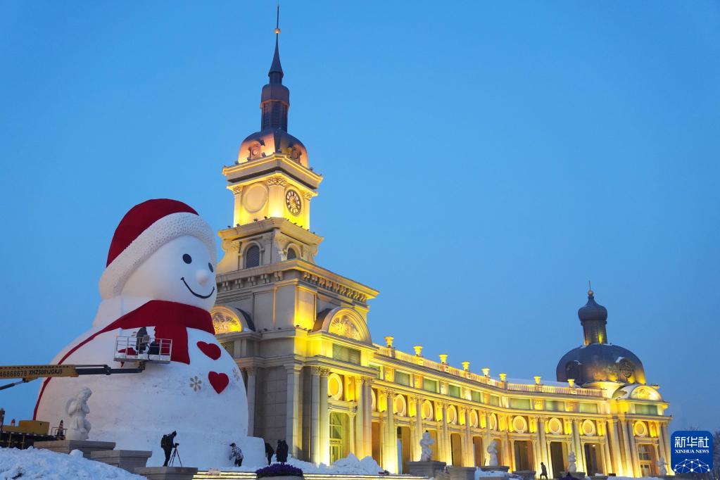 1月4日,在哈爾濱松花江畔,工人進(jìn)行大雪人收尾工作。
