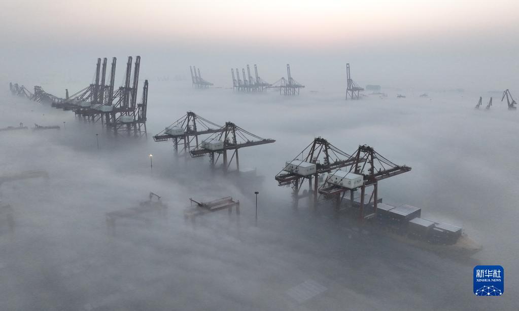平流霧中的唐山港京唐港區景色(1月5日攝,無人機照片)。
