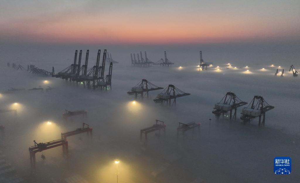 平流霧中的唐山港京唐港區(qū)景色(1月5日攝,無人機(jī)照片)。