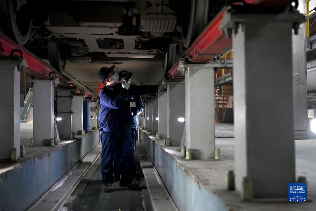 1月4日,合肥南動車運用所的工作人員對動車組列車進行檢修。