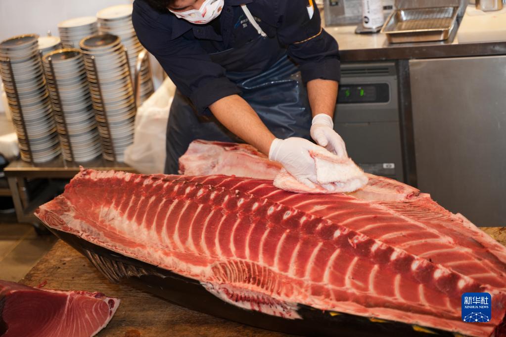 1月5日,廚師在日本東京表參道一家餐館擦拭最高價金槍魚的魚肉。