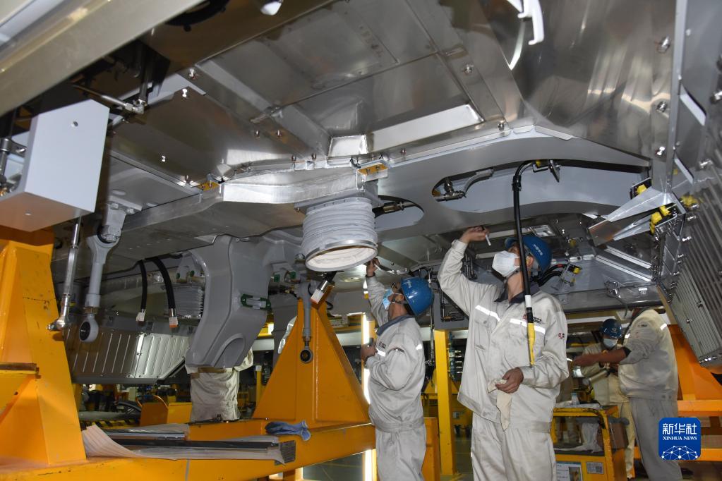 1月4日,總裝車間技術(shù)人員在“復(fù)興號”智能動車組生產(chǎn)線上忙碌。