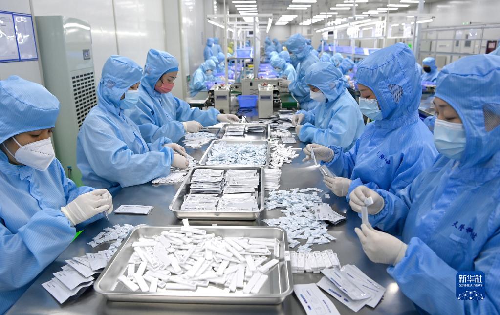西安一家醫(yī)療器械企業(yè)的工作人員在生產(chǎn)抗原檢測(cè)試劑(1月4日攝)。
