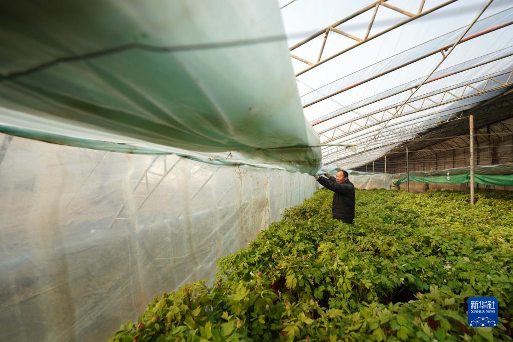 1月5日,花農在河北省柏鄉縣漢牡丹園種植大棚內通過調整遮光簾控制棚內溫度。