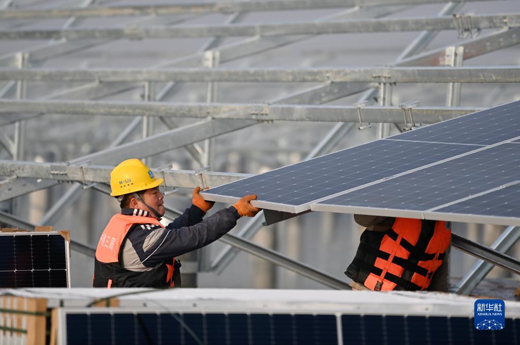 1月5日,建設者在華電海晶光伏項目B標段施工。