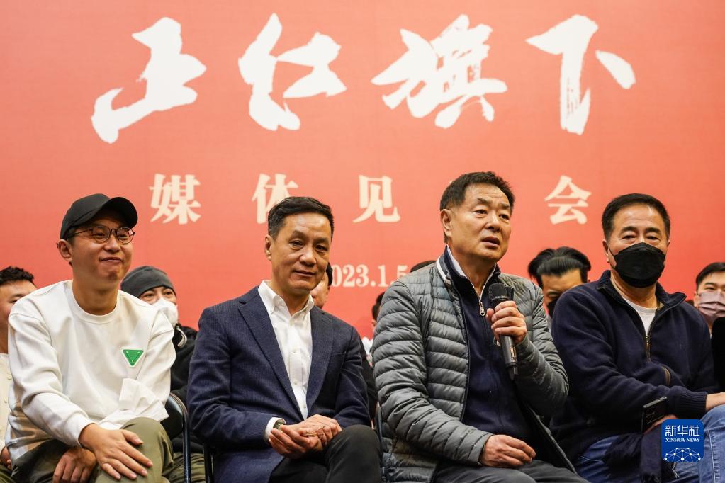 1月5日,在北京人藝排練廳,演員濮存昕(右二)在媒體見面會現場與記者交流。