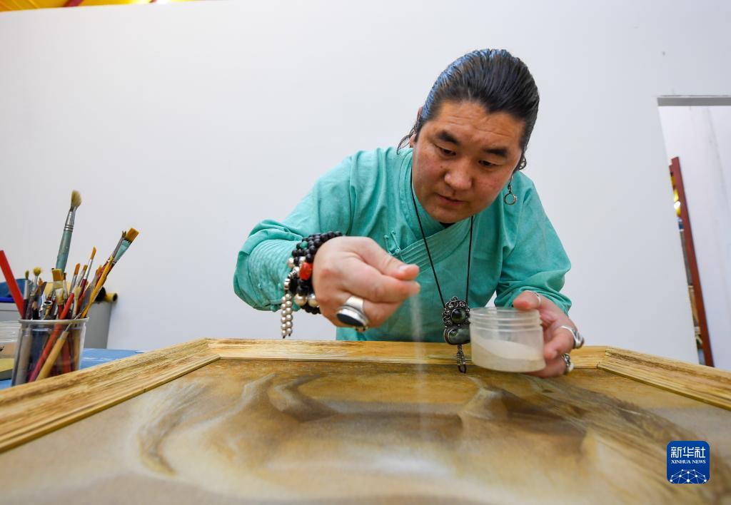 內(nèi)蒙古錫林郭勒盟正藍旗位于渾善達克沙地腹地,生活于此的80后蒙古族青年阿拉騰畢力格取沙為材,進行沙畫藝術(shù)作品創(chuàng)作。他對渾善達克沙地中顏色各異的沙粒進行淘洗、篩選、清理雜質(zhì)、曬干等操作后,加上用糯米汁、牛角等材料熬制而成的天然膠水,就能使各色沙粒在充分粘貼的情況下,依然保持其色彩。他的沙畫作品色彩自然、造型古樸,獨具特色。