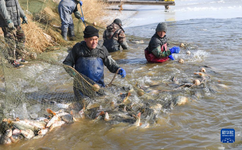 冬日時節,內蒙古達拉特旗樹林召鎮的村民在結冰的魚塘上鑿冰、拉網,捕撈人工養殖的“黃河魚”,以備春節前夕上市。達拉特旗位于黃河“幾”字彎,人工養殖的“黃河魚”是當地的一大特色。