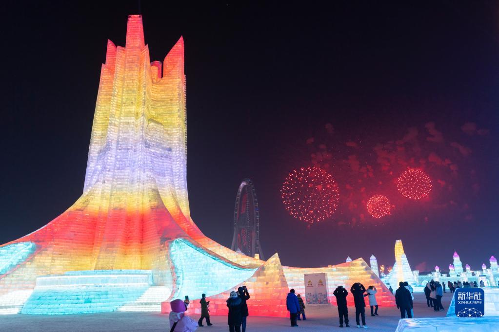 1月5日,冰雪節啟幕焰火在冰雪大世界園區上空綻放。