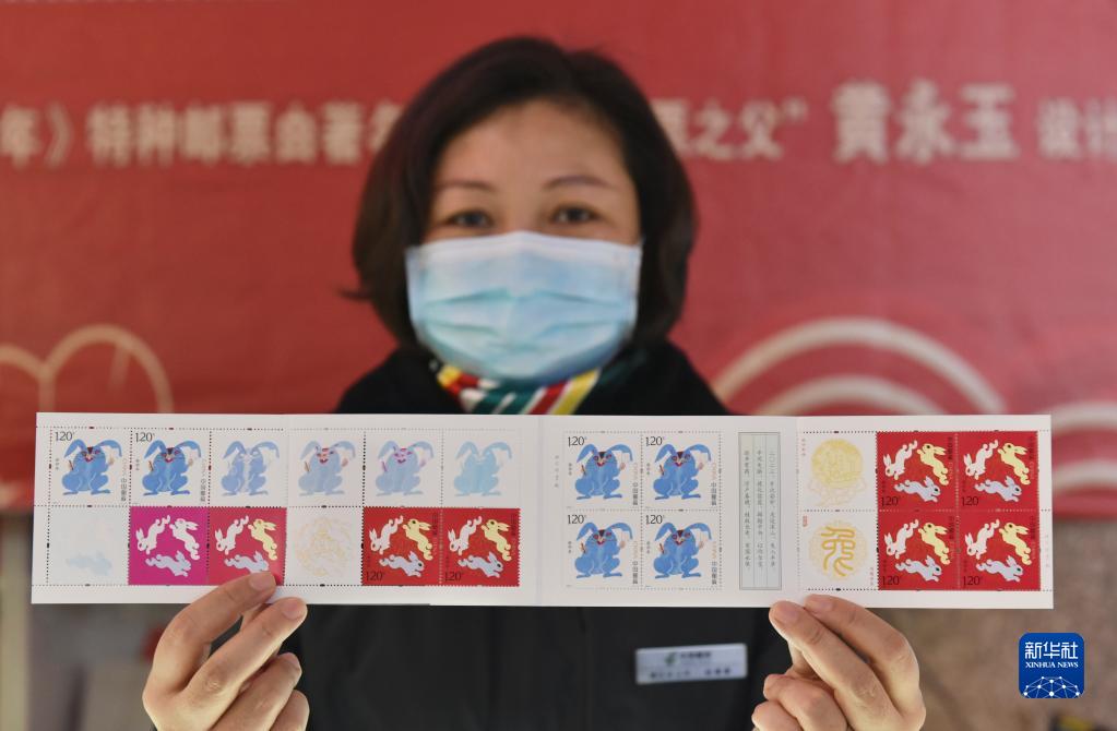 1月5日,在安徽阜陽(yáng),郵政工作人員展示《癸卯年》特種郵票。