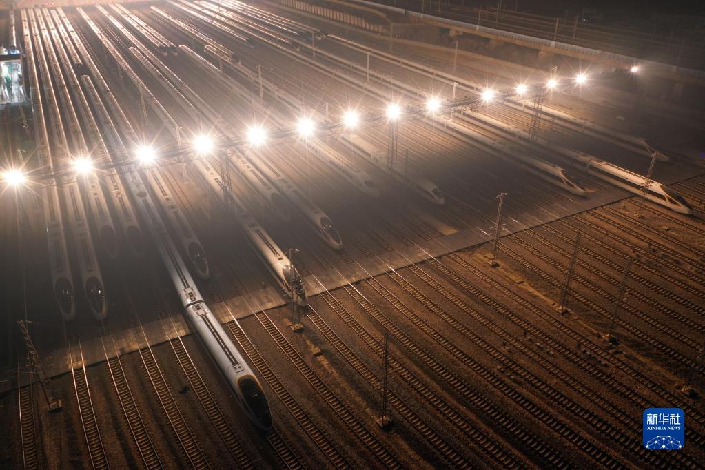 1月6日凌晨,動車組列車停靠在南京動車段南京南動車運用所存車線上(無人機照片)。
