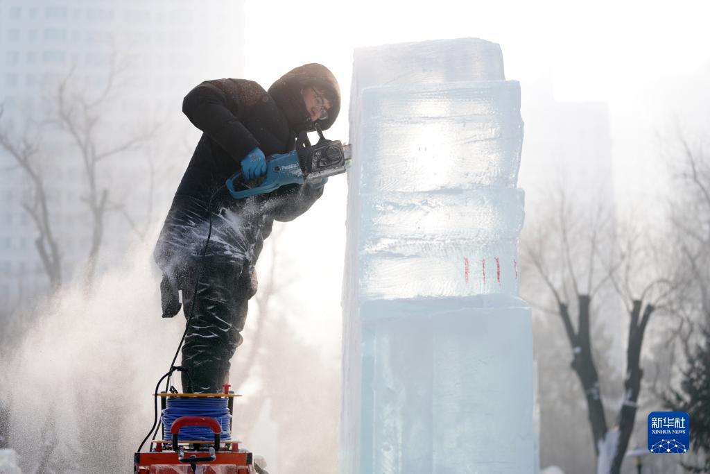 1月6日,在哈爾濱冰燈藝術游園會園區,冰雕師在進行冰雕作品創作。