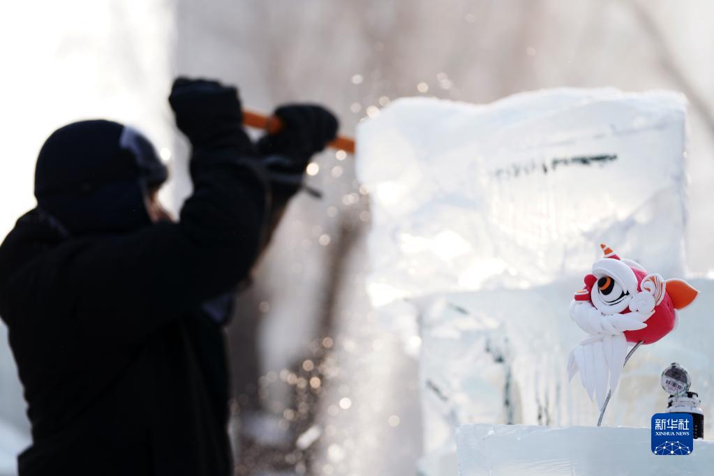 1月6日,在哈爾濱冰燈藝術游園會園區,冰雕師在進行冰雕作品創作。