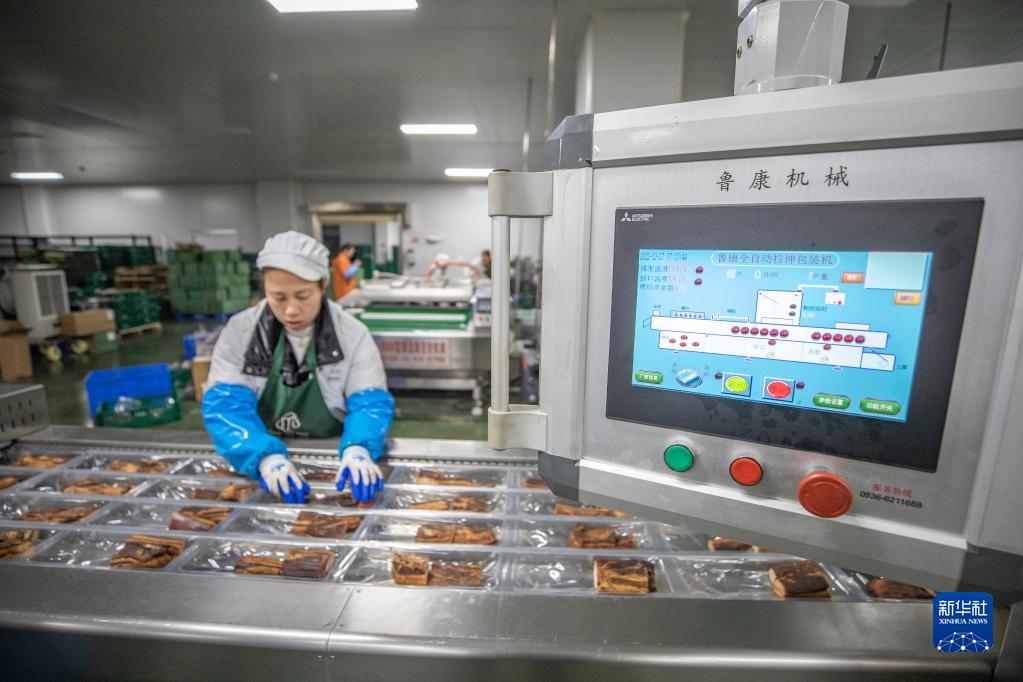 1月4日,在重慶市城口縣坪壩鎮新華村重慶美綴美食品有限公司,工人在外包裝車間利用自動打包機封裝臘肉。
