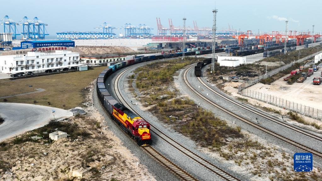 當日,2023年首趟西部陸海新通道鐵海聯運年貨班列從廣西欽州港東站駛出,這列滿載著東盟酥油、椰汁、玉米等食品的班列,預計2天后到達重慶,供應年貨市場。