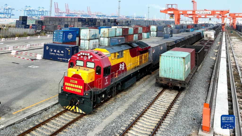 當日,2023年首趟西部陸海新通道鐵海聯運年貨班列從廣西欽州港東站駛出,這列滿載著東盟酥油、椰汁、玉米等食品的班列,預計2天后到達重慶,供應年貨市場。