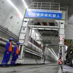 1月6日,在中鐵隧道局上海市域鐵路機場聯絡線11標項目施工現場,一輛新能源雙頭車從中隔墻拼裝機器人旁駛過。