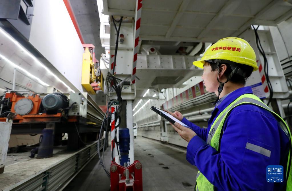 1月6日,在中鐵隧道局上海市域鐵路機場聯(lián)絡線11標項目施工現(xiàn)場,技術(shù)人員使用平板電腦操作中隔墻拼裝機器人施工作業(yè)。