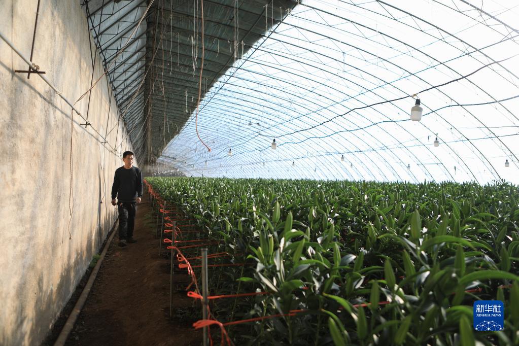 1月5日,在遼寧省凌源市小城子鎮楊大營子村,花農胡永全在大棚內檢查百合長勢。