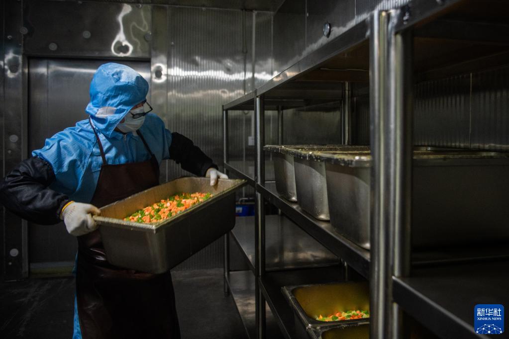 1月6日,武東餐飲基地工作人員將制作好的菜肴送入冷藏庫保存。