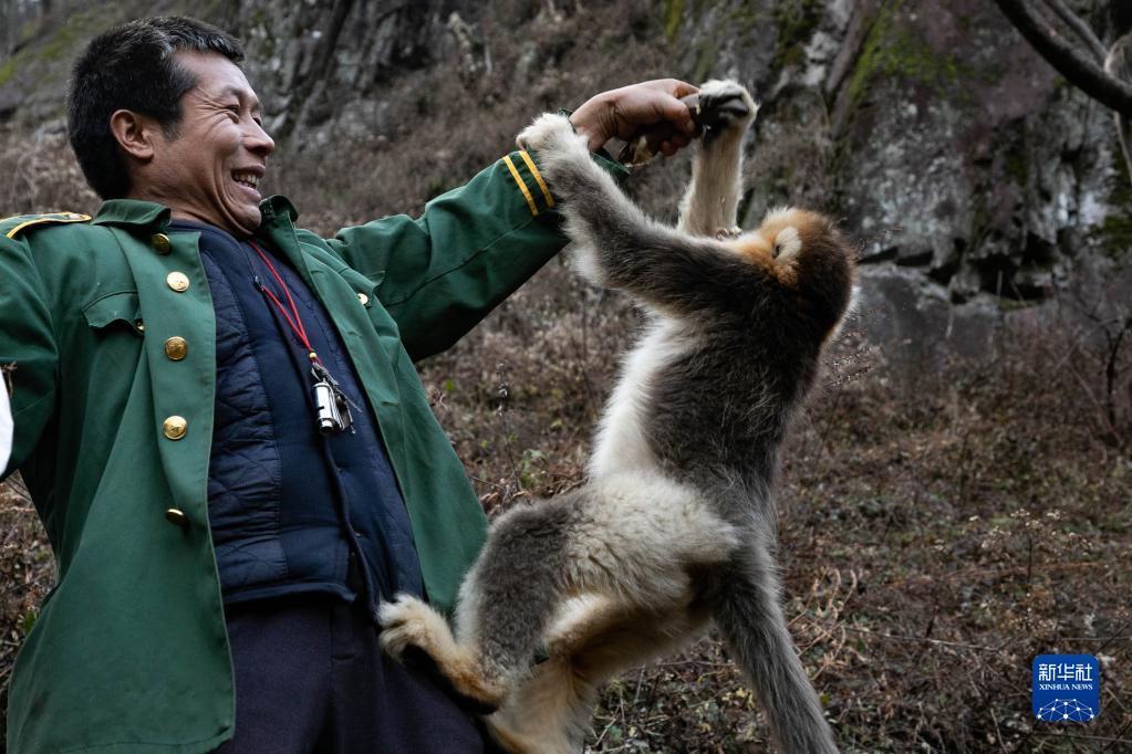 楊忠錄與大熊貓國家公園甘肅省片區裕河園區內的川金絲猴互動(1月4日攝)。